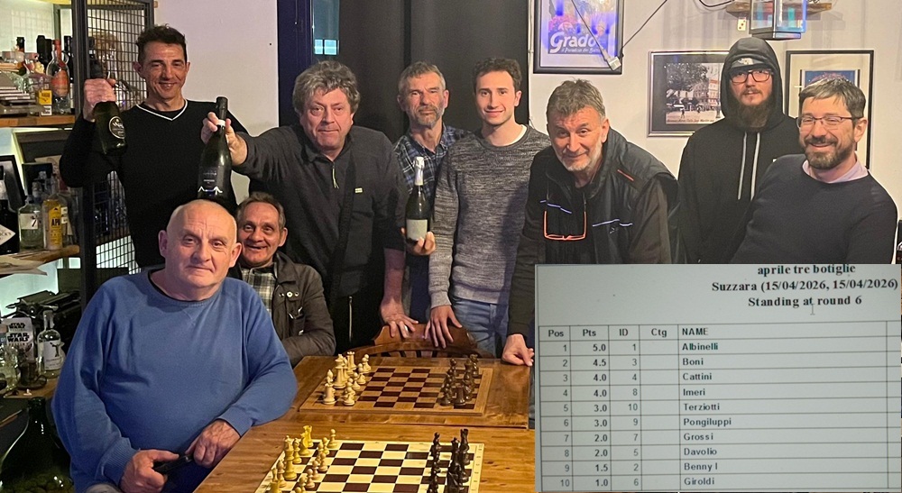 Suzzara 15/04/2026: Continua il Tour scacchistico al Farbrick Drink Bar di via 23 Aprile 17, gestito da Dino Rovesti. Anche a questo giro ha Vinto Alberto Albinelli, di Suzzara il podio : secondo Boni Gianni di Rivarolo Mantovano, terzo il Modenese Simone Cattini, su dieci partecipanti, con cadenza 12′ con orologi di gioco analogici , sei i turni di gioco l’appuntamento e al prossimo mese.